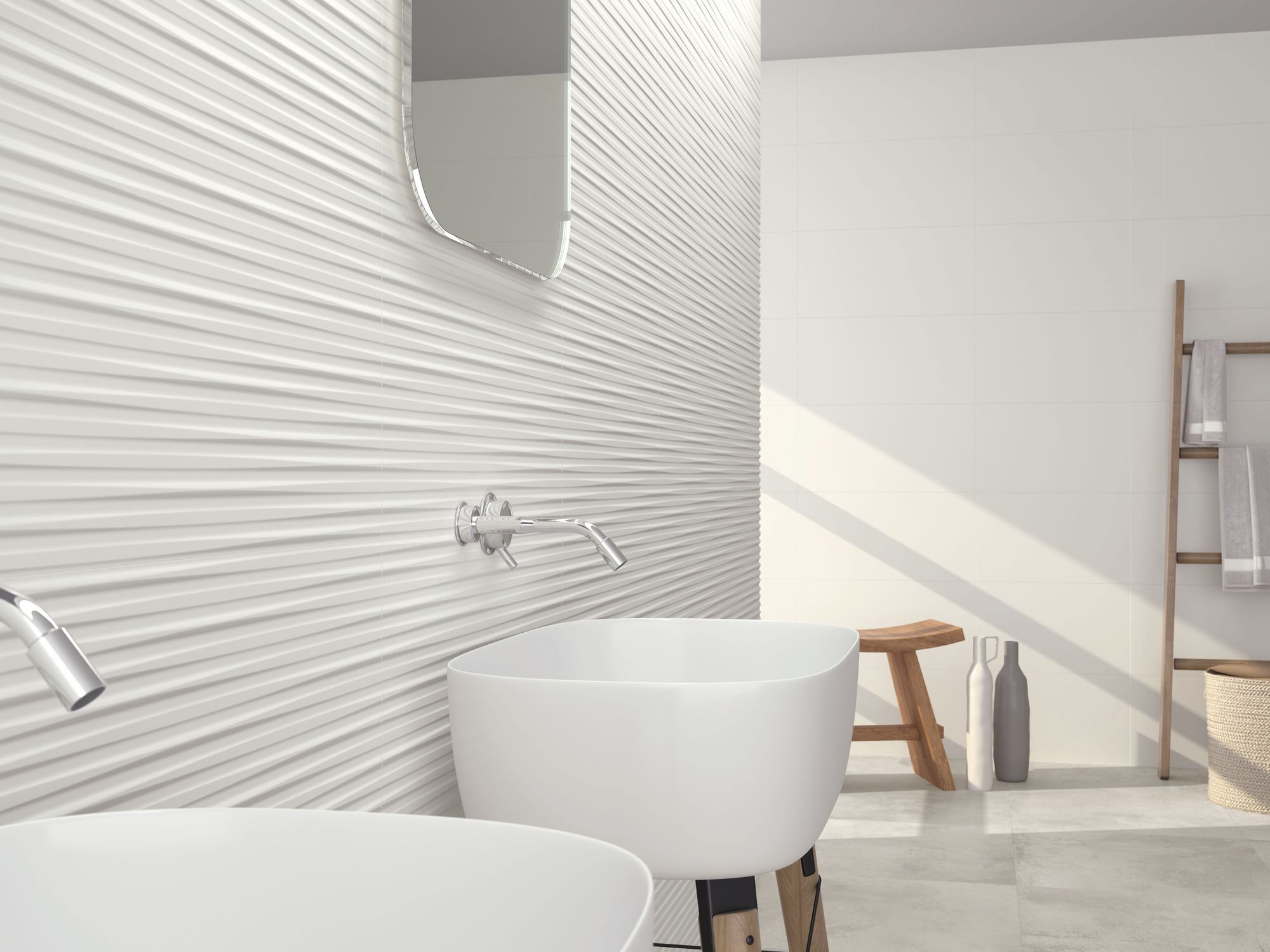 The collection’s striking accent piece is the Blanco Wave Decor tile, which showcases a strong, undulating horizontal relief pattern. This three-dimensional, wave-like texture adds a profound sense of movement, depth, and architectural interest, transforming feature walls in a bathroom or shower into luxurious, sculptural elements. Together, the coordinating smooth and textured tiles offer designers and homeowners the flexibility to create visually rich environments while maintaining a bright, timeless, and unified aesthetic across residential and commercial projects.