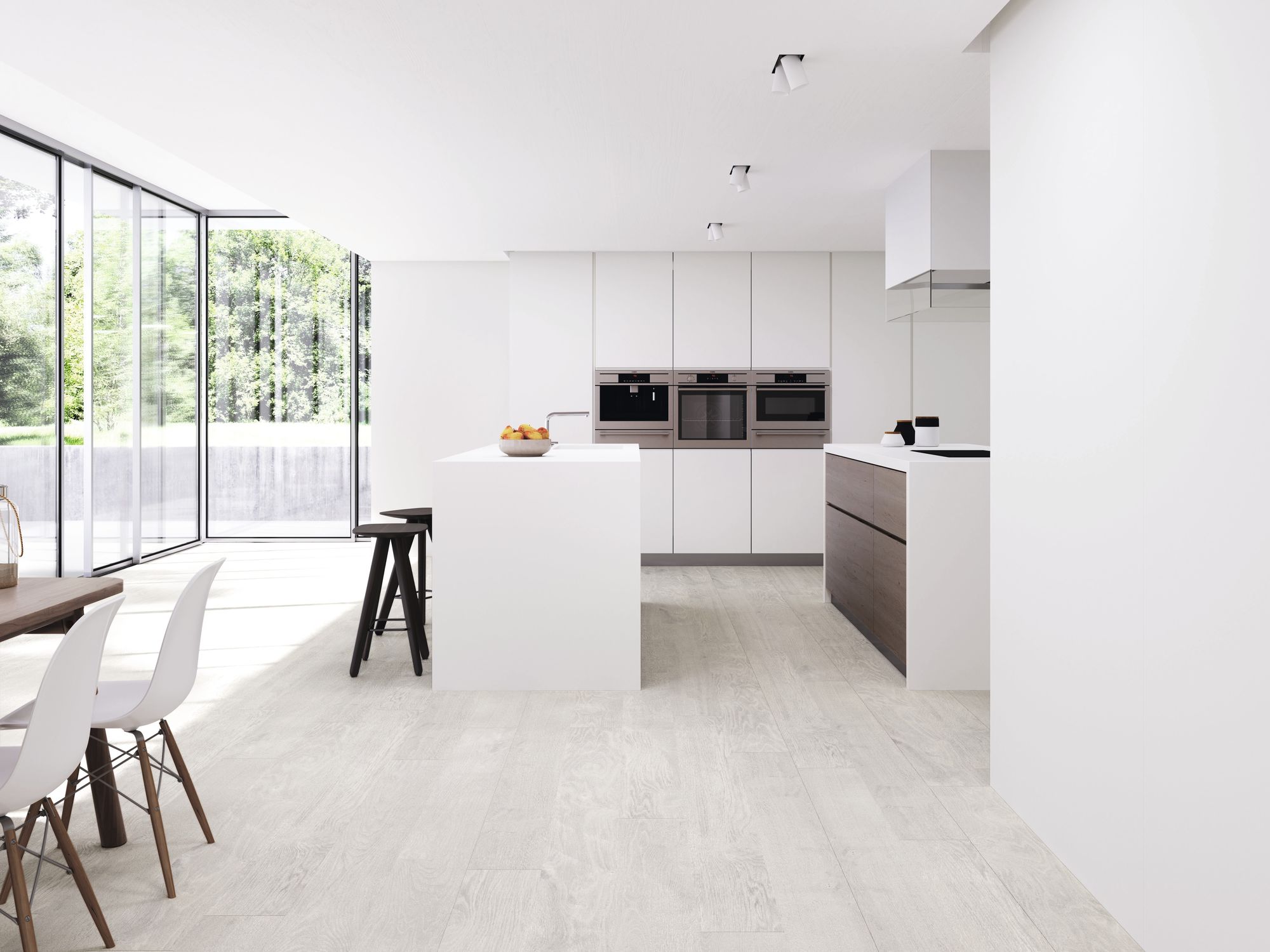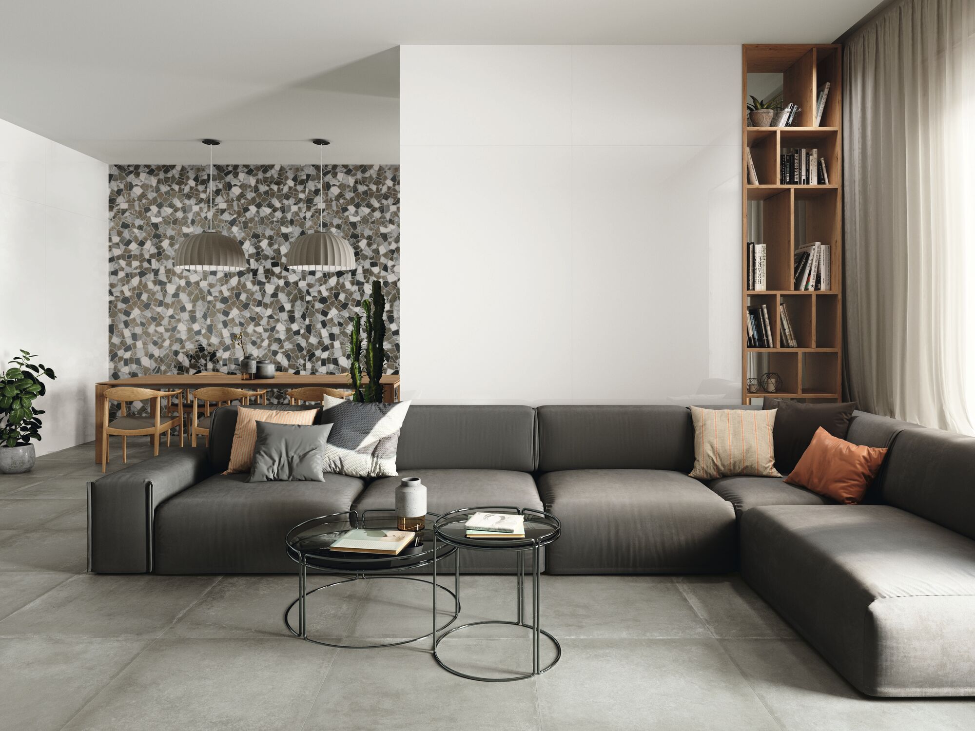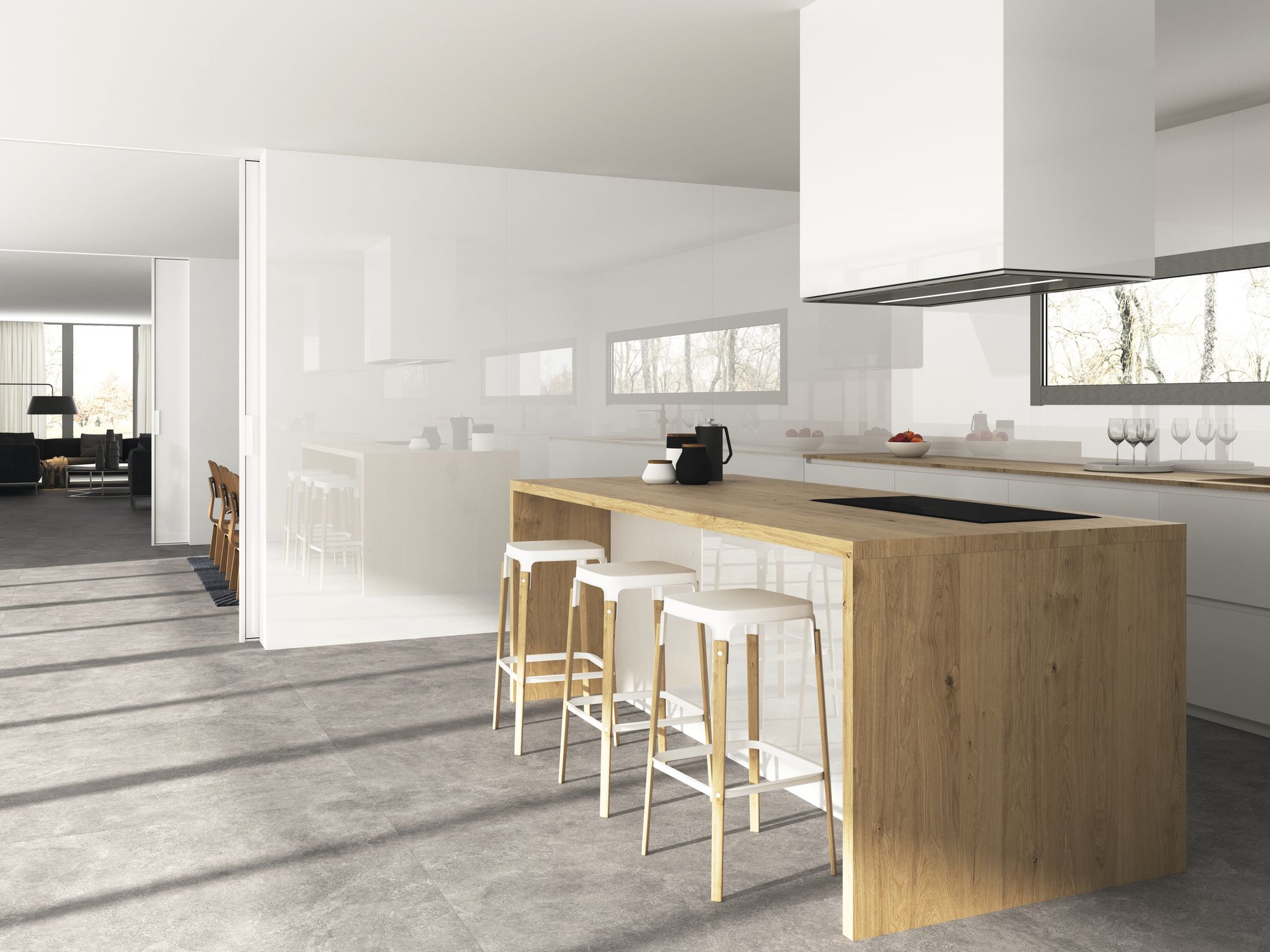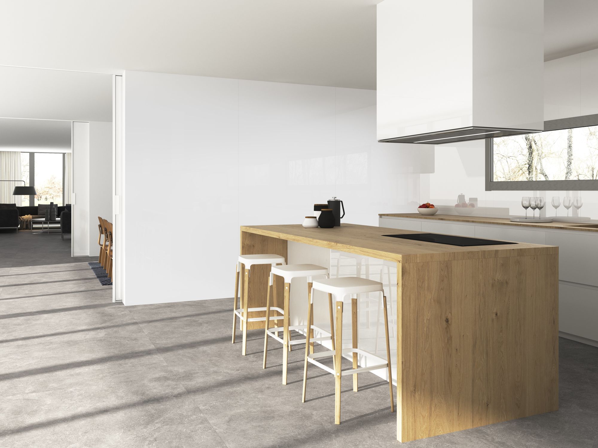 The Blanco Collection is a sophisticated range of white tiles designed to bring light, spaciousness, and contemporary elegance to any interior space. This versatile collection features both smooth, large-format field tiles and a complementary textured decor, allowing for dynamic and cohesive design schemes in bathrooms, living areas, and kitchens. The foundation of the collection is the plain white tile, offered in various large formats such as 120×120 cm (seen as flooring in the living room) and the smaller, versatile 30×60 cm. These tiles feature a clean, bright white tone and a subtle finish, perfect for creating seamless, minimalist backdrops that amplify natural light.