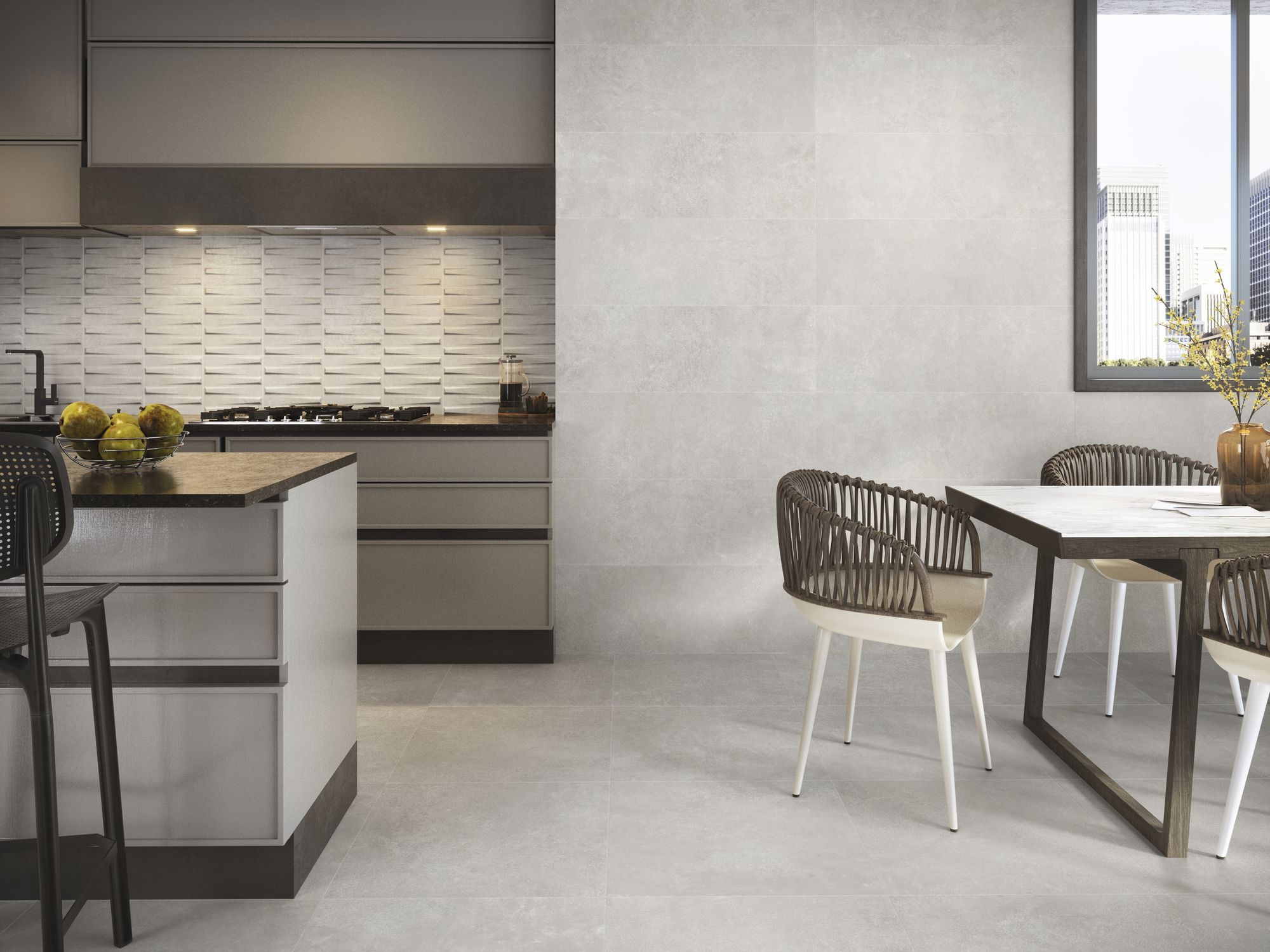 The Groove Collection presents a sophisticated and versatile tile solution that masters the balance between minimalist concrete aesthetics and tactile surface design. The dominant flat field tile provides a clean, continuous backdrop with a fine, subtly mottled texture reminiscent of smooth, light-colored cement. This neutral, grounded look is perfect for creating expansive, seamless surfaces on both floors and walls in modern kitchen and dining spaces, offering a contemporary foundation that pairs effortlessly with various colors and materials, from sleek cabinetry to warm wood tones.