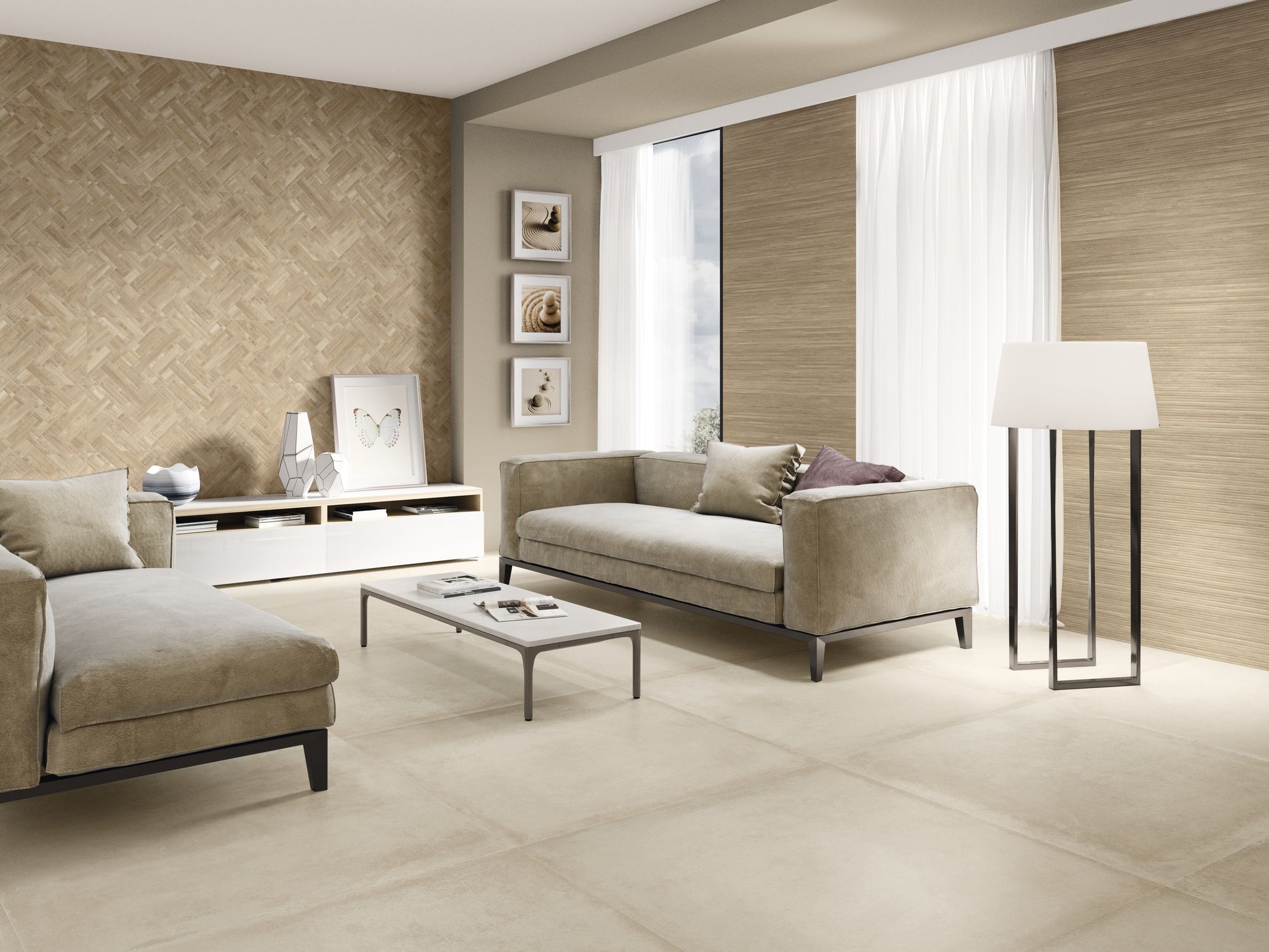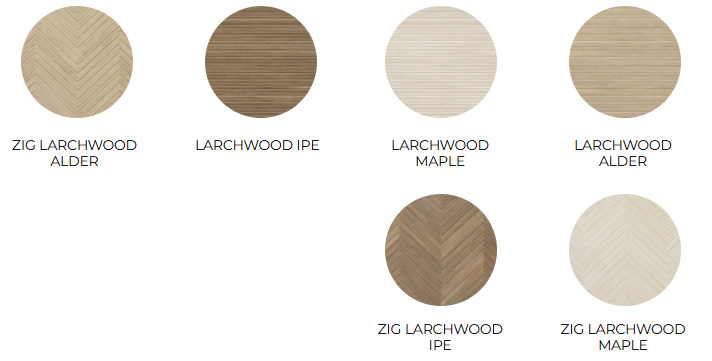 To introduce dynamic movement and architectural interest, the collection provides a range of compelling decorative options. The Zig Larchwood pattern transforms the wall with a bold chevron or herringbone motif, turning any vertical surface into an immediate focal point. Additionally, the series includes an intricately woven basket-weave pattern, adding a refined geometric texture that is perfect for feature walls and niches. By combining the plain lineal tiles with these varied graphic elements, the Larchwood collection offers a cohesive and flexible solution for creating elegant, multi-layered spaces with the lasting durability and maintenance benefits of porcelain and ceramic.