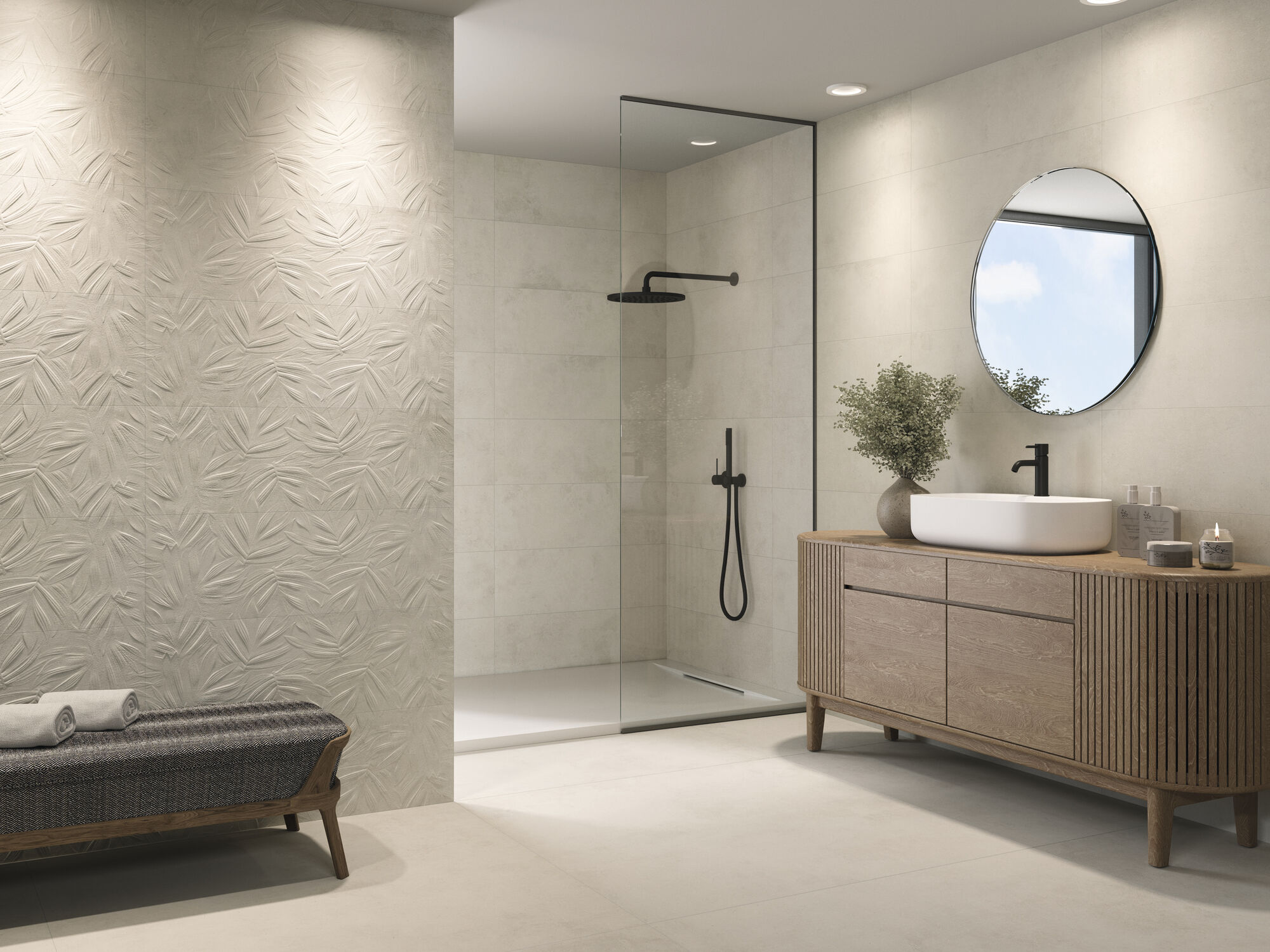 Perfect for achieving seamless design continuity across large areas, the Village series is suitable for both floors and walls in any residential or commercial space. Its timeless neutrality allows it to harmonise effortlessly with diverse materials like warm woods, polished metals, and soft textiles, as seen in the various living spaces and luxurious bathrooms. The collection includes options for creating dramatic feature walls, such as the wood-effect geometric pattern, demonstrating its potential for dynamic focal points. Choose the Village collection to infuse your environment with calm, sophisticated simplicity and a robust, enduring quality.