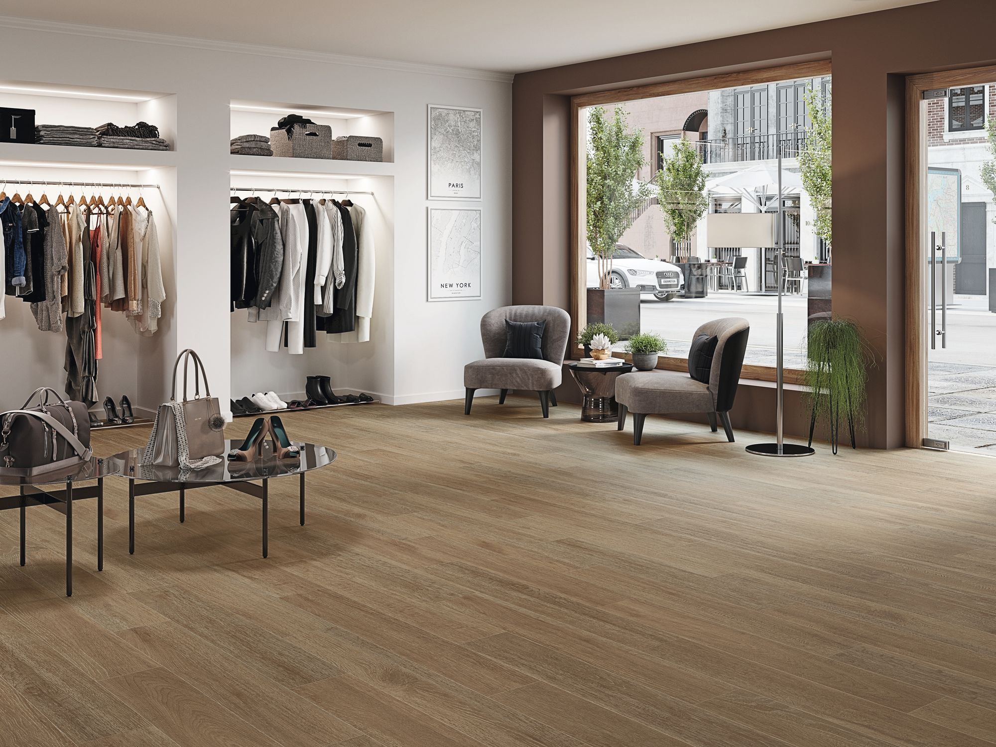 The Carpatos collection offers the timeless warmth and organic texture of natural wood in the superior durability of plank-format porcelain tile. Designed to flawlessly replicate the authentic graining and subtle color variations of true hardwood, this collection comes in a range of sophisticated tones, from light, airy blonde and bleached woods to richer, more complex grey-brown and taupe hues. The images showcase its versatility, providing an inviting yet robust flooring solution for various settings, including high-traffic commercial spaces like boutiques, and open-plan residential areas like modern kitchens and living rooms.