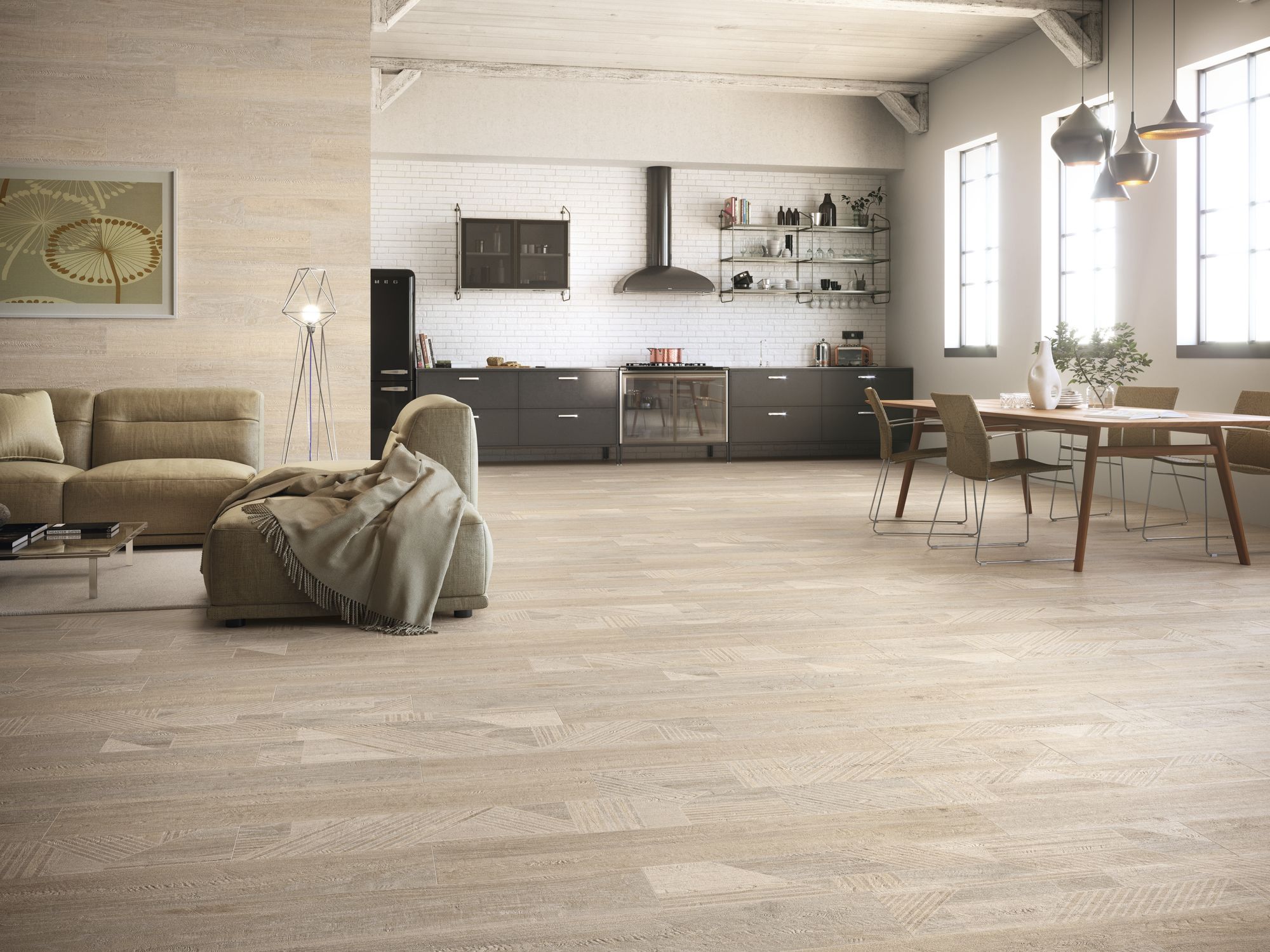Offered in a realistic plank format (e.g., 20×120 cm), Carpatos delivers a visually continuous, low-maintenance surface that is ideal for moisture-prone areas where real wood is impractical, such as kitchens and bathrooms. The collection also features unique variations, including tiles with a distinct geometric, chevron-like parquet pattern, allowing for more elaborate, custom-look floor designs. By combining the aesthetic appeal of wood with porcelain’s resilience against scratches, water, and fading, the Carpatos collection provides a perfect, enduring foundation for any interior design vision.